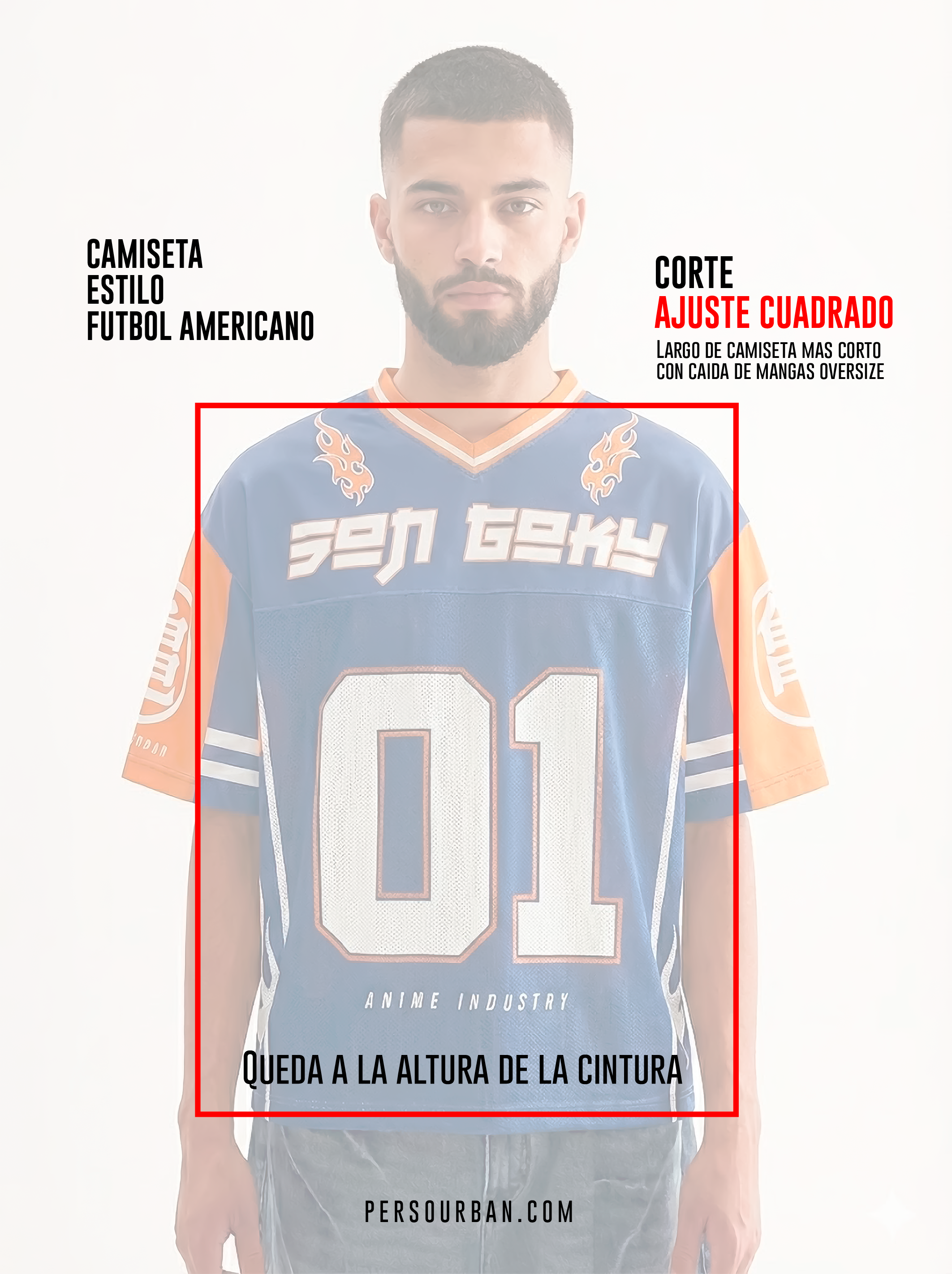 Camiseta estilo fútbol americano con corte Boxy fit (ajuste cuadrado) tela con malla en la parte inferior y cuello de rib estampados en sublimacion.